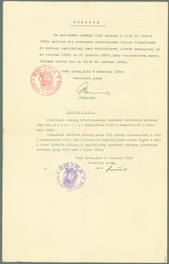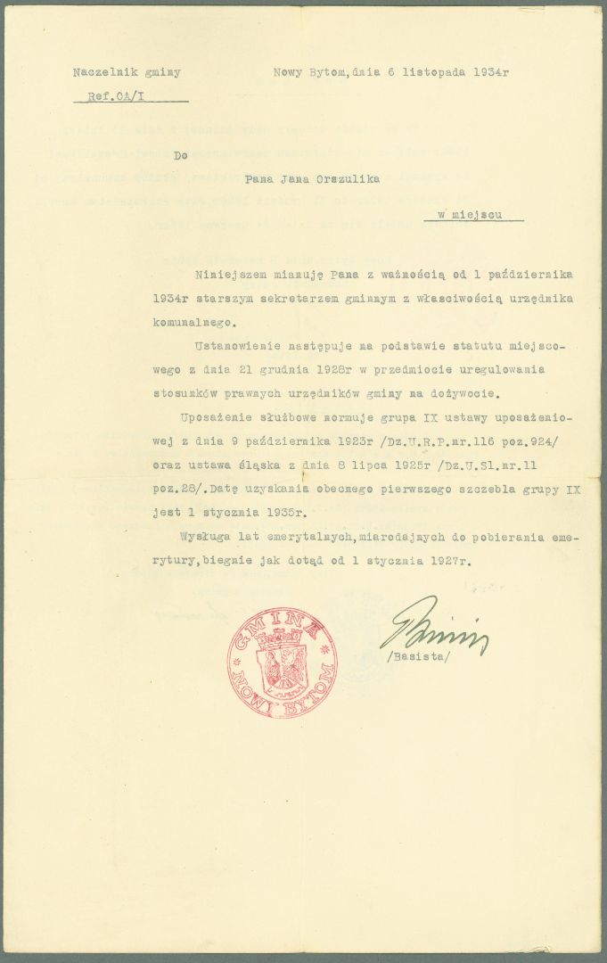 Wśród dokumentów znajduje się też akt nominacji na starszego sekretarza z podpisem ówczesnego naczelnika gminy Nowy Bytom, Pawła Basisty. Dokument datowano 6 listopada 1934 roku (zdj. 2 i 3).